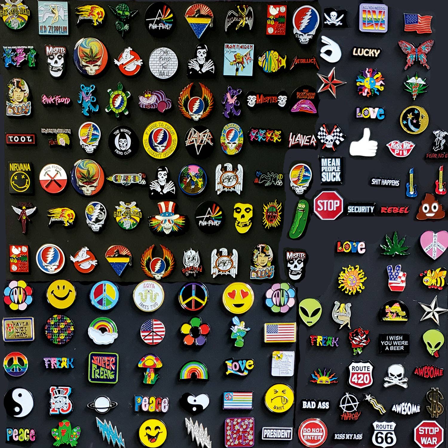 You will receive an assortment of individual enamel pins in this listing with NO duplicates! The majority of the pins will be retro band pins with a touch of pop culture and hippie styles. Die struck lapel pins filled with enamel color by hand, comes carded. Each pin measures approximately 1.25", soft enamel, double and single pin back with rubber clutch. Please select your favorite genre or the quantity you would like in your mix from the drop down menu. *You can message us before purchasing if you would prefer to pick your own mix.