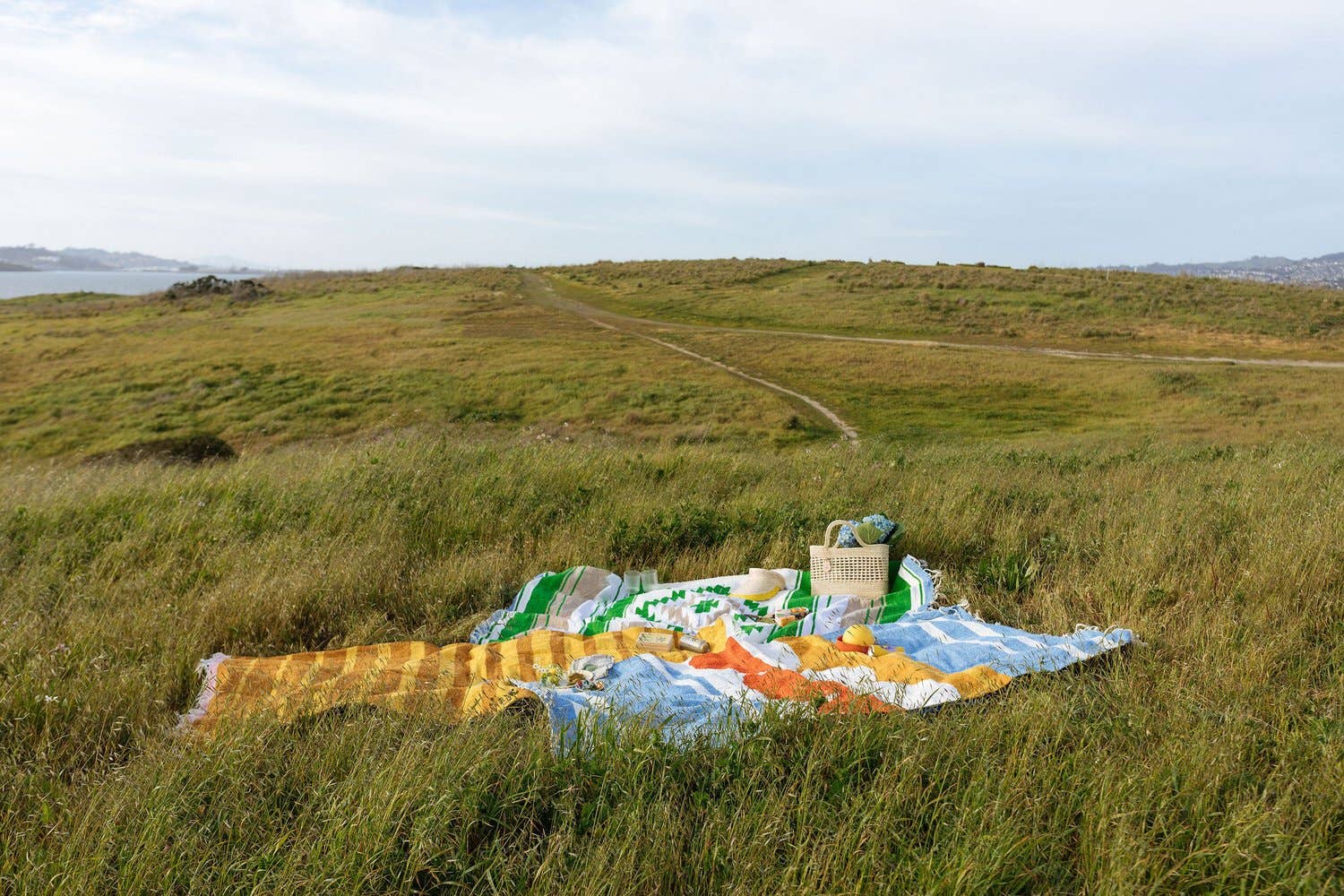 The playful and fun Paseo (to stroll) colorway features joyful palette of yellow ochres and bright papaya, all on a sea of sky blue. These cheerful blankets embody a leisurely stroll on a cloudless day and will surely put a spring in your step.