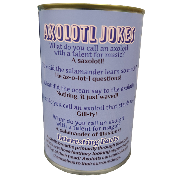 Funny axolotl jokes and interesting facts on the can.
