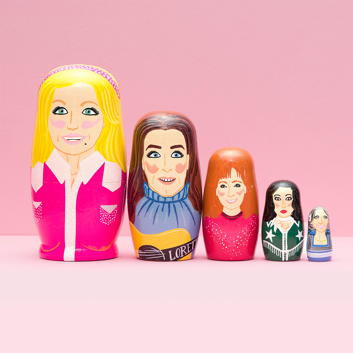 These women are stacking' together and stickin' it to the partiarchy. Enjoy the dulcet tones of these famous females and turn your living room into the Ryman mainstage. These women are all about busting through glass ceilings, and breaking out of their (wooden) shells. And remember, your favorite singer could be Two Dolls Down. Set of 5 wooden nesting dolls that fit into one another. Each box opens up to reveal a star-studded dressing room!