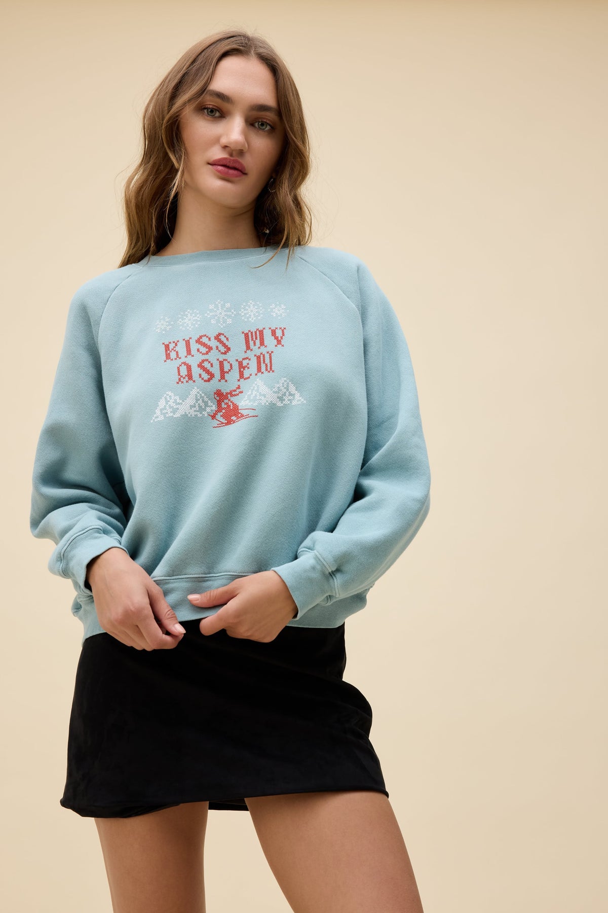 An altitude essential brings winter wit. 'Kiss My Aspen' lands in a cross-stitch inspired design as your perfect complement to a fireside spritz.