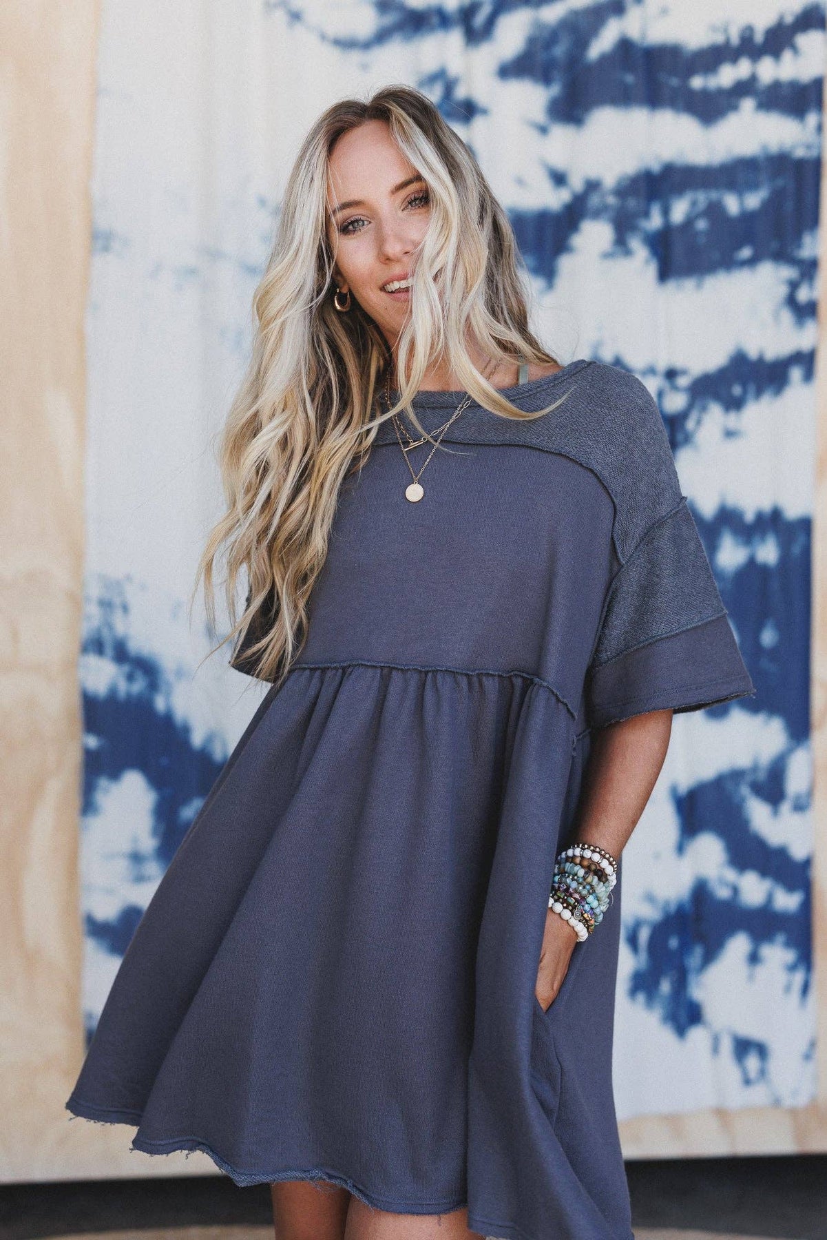 This babydoll dress looks amazing with tall cowboy boots and long necklaces. * Short sleeves * Round neck * Pockets