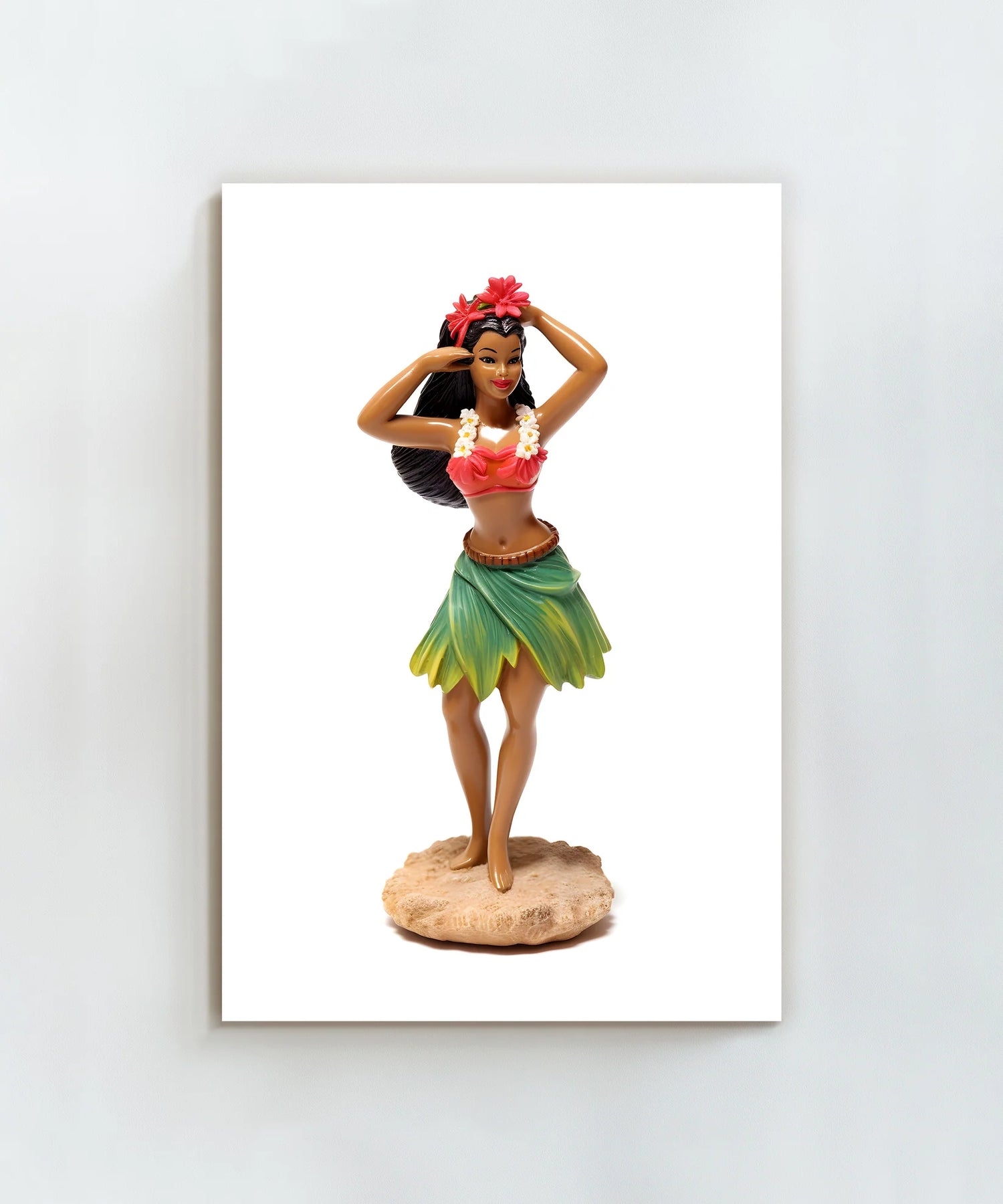 This piece is print is #1 in a series dedicated to the most iconic of tropical souvenirs, the plastic dancing hula girl. Usually found swaying atop a dashboard, these classic figurines bring the laid back Hawaiian vibes no matter where they go, and now that includes your walls!