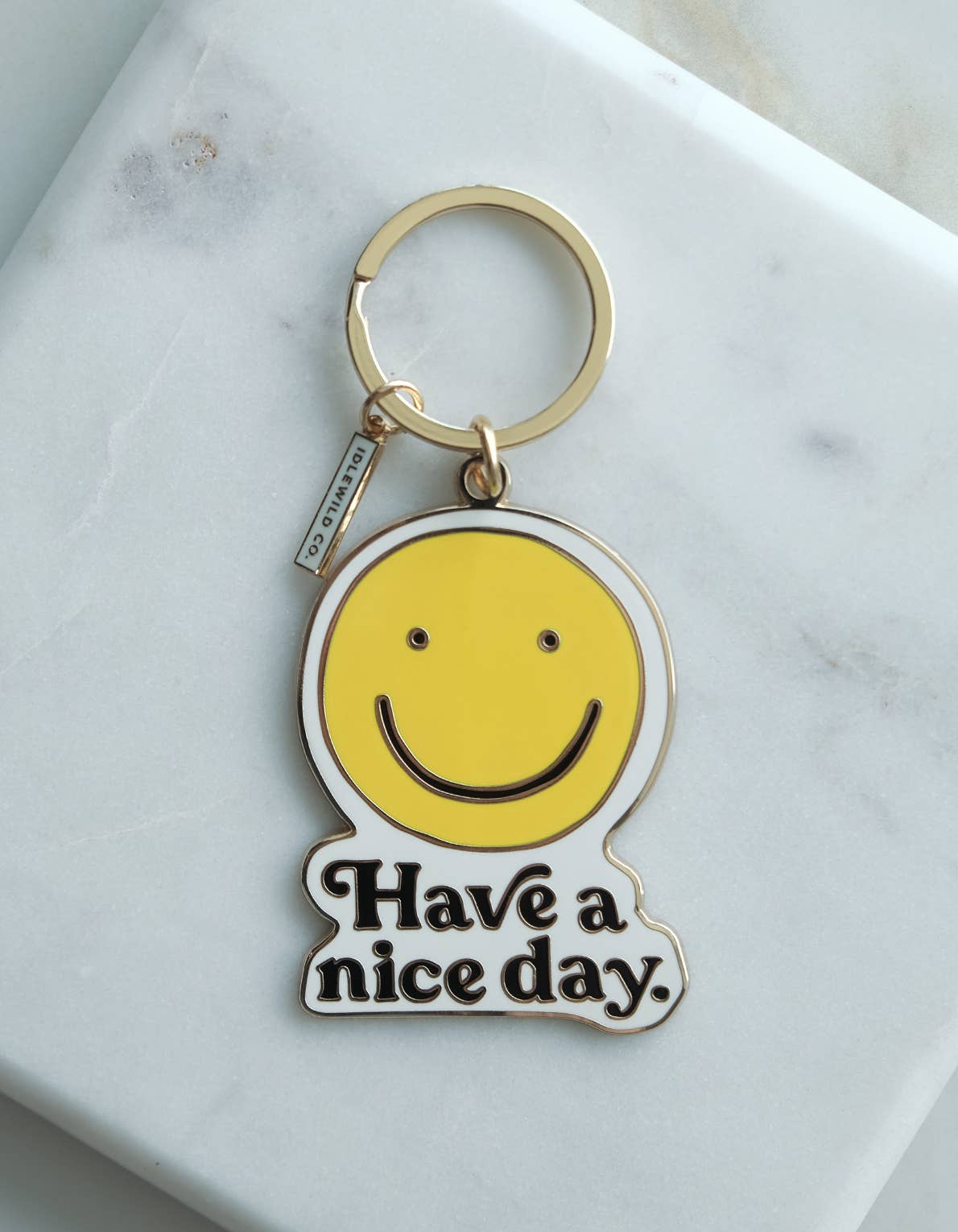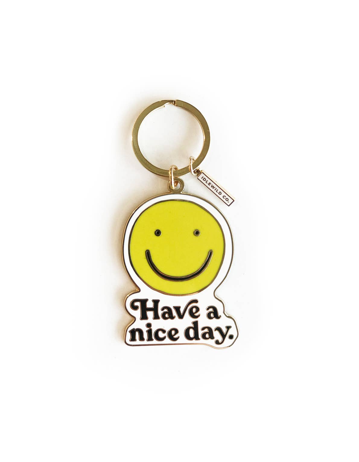 Our brass and enamel keychains make for an eye-catching accessory, perfect for finding those keys at the bottom of your bag! Created from our hand painted designs, they're fabricated with vibrant, hard-enamel and polished to a shine. We offer them in a pretty, plastic-free gift box, or opt in to our unboxed option for a reduced cost. • BRASS AND ENAMEL KEYCHAIN • CHARM MEASURES APPROX. 1 X 2 1/4″ Keywords for SEO: Keychain, Brass Keychain, Enamel Keychain, Smiley Face, Happy, Have A Nice Day, Yellow, Accessory, Gift, Colorful, Idlewild Co., Idlewild, gift ideas, hostess gift, housewarming gift, housewarming, home decor, easter, key ring, key ring holder, motivational gift