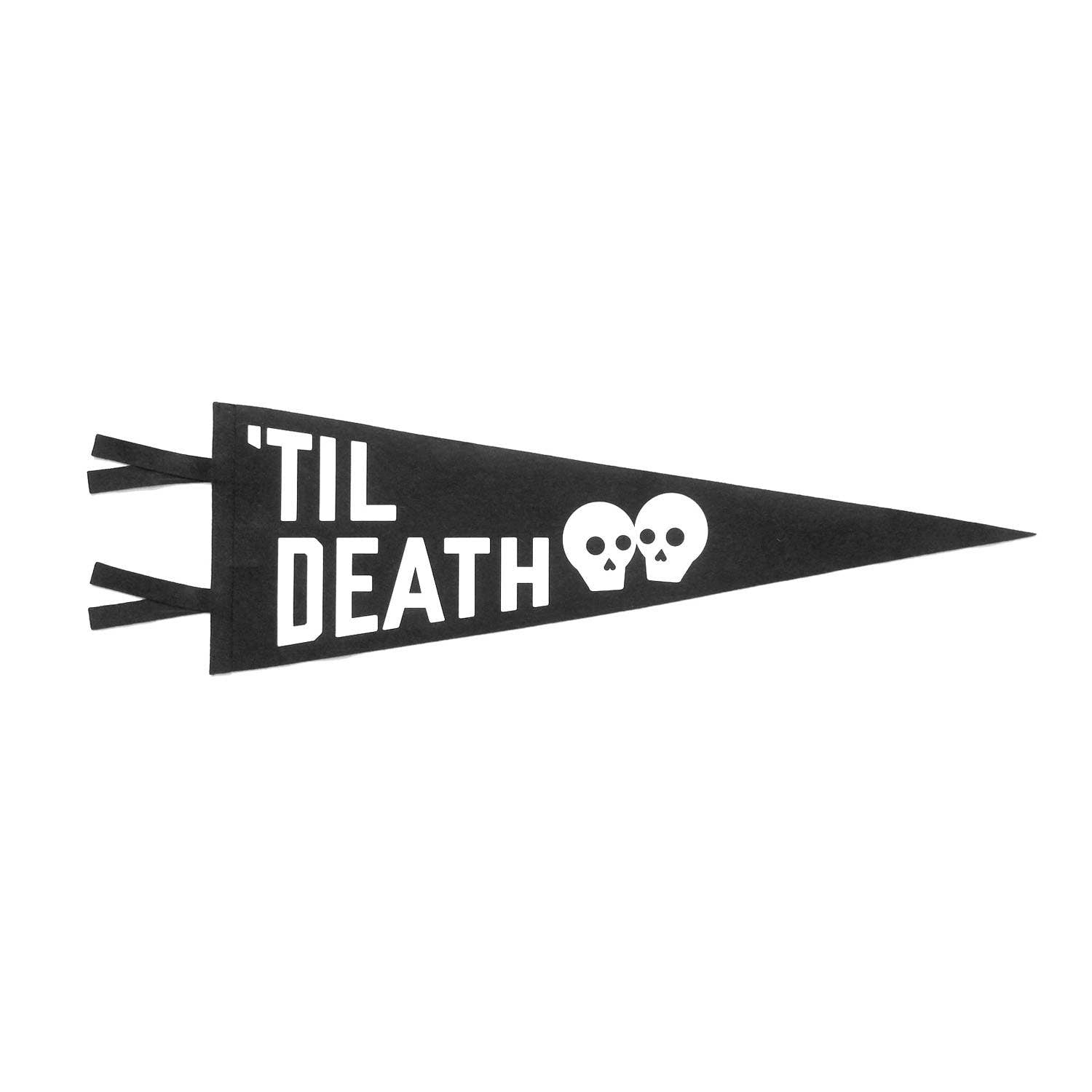 For better, for worse, for richer, for poorer, in sickness and in health. This custom 'Til Death pennant's for those in it for the long haul. Available in our 5 foot banner. Size: 9" x 27" Material: Cut-and-sewn wool felt, screen-printed design Color: Black.